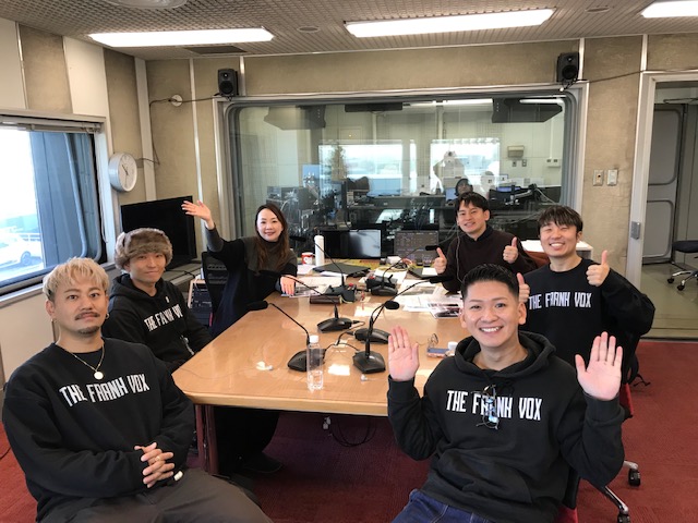 今日はスタジオに4人組グループ「THE FRANKVOX(フランクボックス)」の皆さんにお越しいただきました。2ボーカルのRYO(リョウ)さん、YASU(ヤス)さん、2MCのSNG(シュンゴ)さん、RYO-TA(リョータ)さんです。皆さん関西出身です。